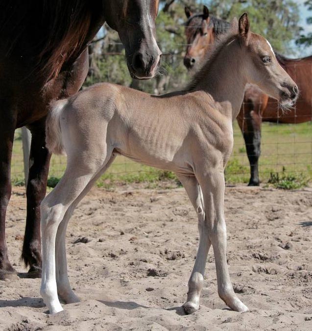 very much like a silver bay or brown foal with her grayish silver mane and white tail and muted body color. Her sire and dam each have a line to known silver dapple lines; however they