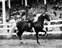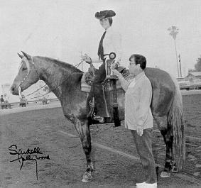 1970 registered as chestnut mare, actually a silver bay. Janie Murphy, then age 17, up. Color photo courtesy of Janie Murphy.