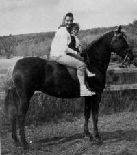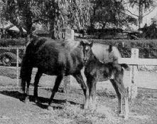 Left: It is interesting that both Betsy Joaquin and her half sister Betty Joaquin (Joaquin Morgan X Dan's Betty, by Dan), pictured here, were registered as "dun with light mane and tail", although neither of their parents were dun. This might possibly indicate that their color appeared to their breeders to be in some way different from the liver chestnut that they resemble in these black and white photos, and that "dun" was the only thing they could think of to call them. Betty is shown here with her 1956 black filly foal by Anndy Pershing, Poco's Sebrena. Right: Another view of Betty Joaquin.