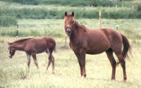 The chestnut (carrying silver) mare Taha Holly Q (Crimson Jack x Q Tawny), f. 1980, with her 1987 chestnut (carrying silver) filly,