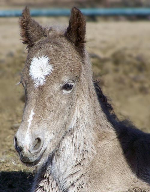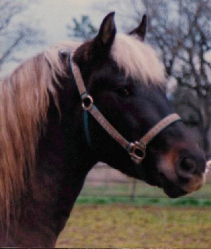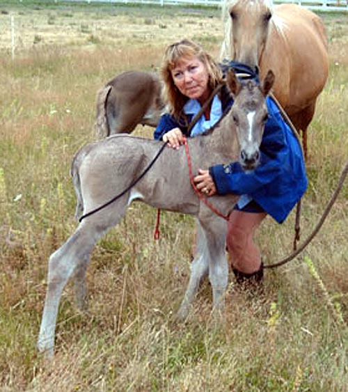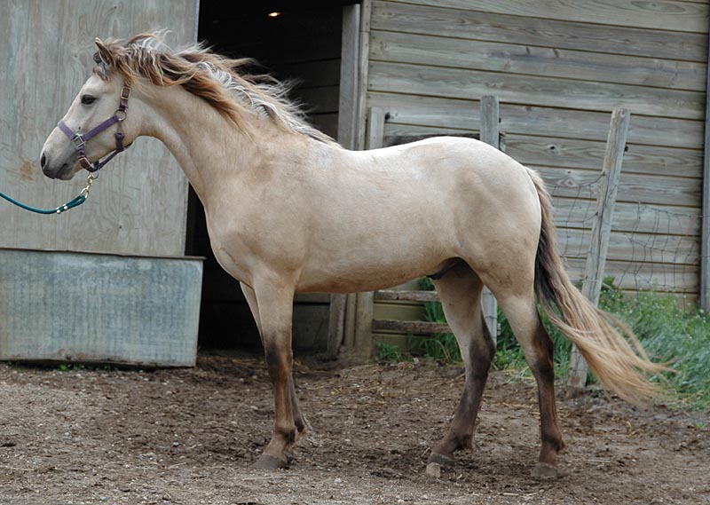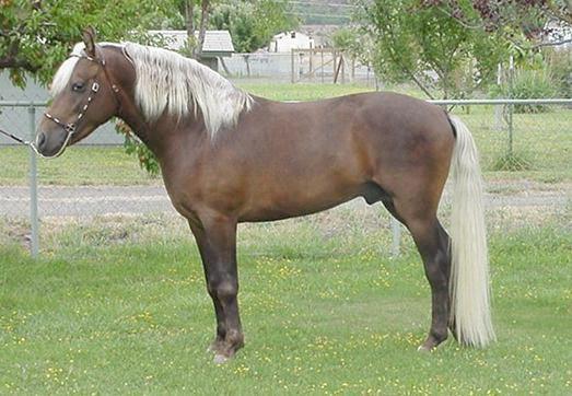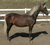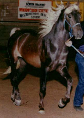 Another silver dapple offspring of Foxton Fawn is S Bar B Blacksaddle Chester, sired by H-Saracen (smoky black). Chester, foaled in 1994, sired just two foals before he was gelded- a bay mare and the silver stallion pictured next.