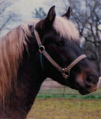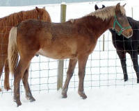 Here is another picture of Whiting's Fancy Star (Foxton Debonair X Foxton Fawn), 1999 silver mare. You can see how much darker she is in her non-sunbleached winter coat here. She was a coming two year old in this picture, and you can see a yearling picture of her in her summer coat on the Morgan Colors website. Photo courtesy of her owner Joyce Urroz.