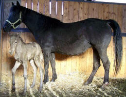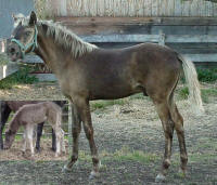 her because being chestnut, she has no black hair to dilute. Pictured with Suzie is her 1998 bay silver Morab filly by Blu Teal, Tamar's Silk N Satin. In 2004, Suzie produced a dark bay/brown silver colt