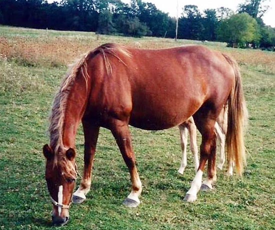 WCG's Little Sue (J Wakan Lightning Strikes X Spihos Grace), 1996 chestnut (carrying silver) mare owned by Dwight and Yolanda Williams, PA.