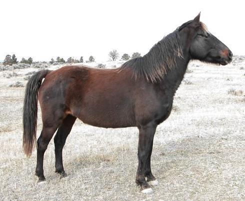 1998 silver dapple mare owned by Karlene Gose of Inyan Kara Morgans. This mare's mane and tail have darkened considerably as she has aged; as a weanling she looked much like her half sister Fancy pictured above. Age-darkened silvers generally do retain a bit of silver hair in the forelock, on the ends of the mane, and tailhead; otherwise, they may look very much like a dark chestnut or sun faded black.